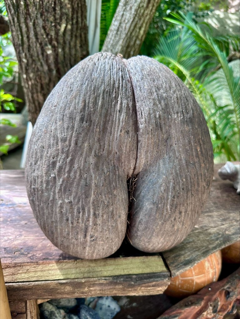 Das Symbol des Stempel erklärt sich wie folgt . Nur auf den Seychellen wächst diese weltweit einzigartige Palmenart . Deren Samen (Nuss) hat eben diese „erotische Form“ (dessen Gewicht tatsächlich bis zu 30 kg / Stück sein kann )