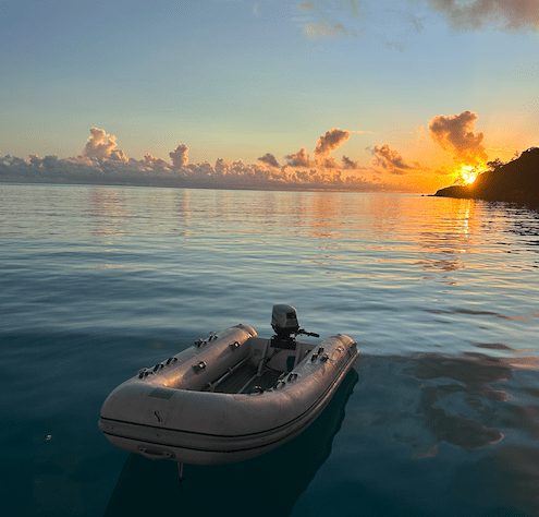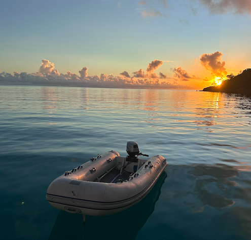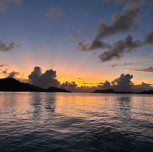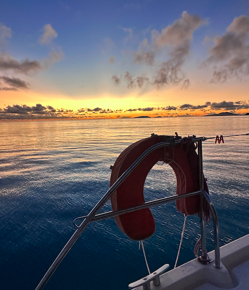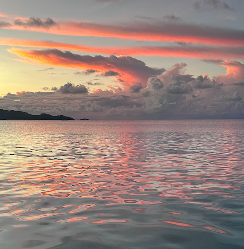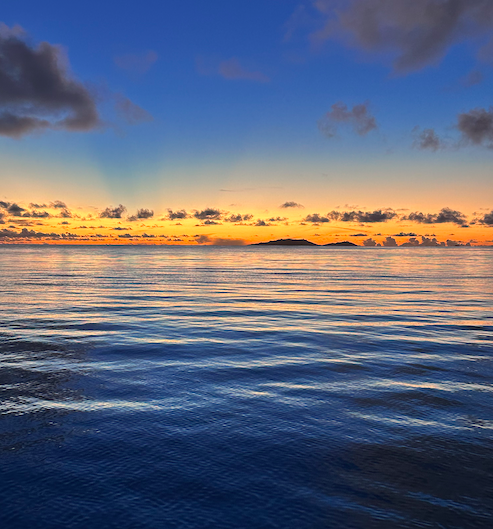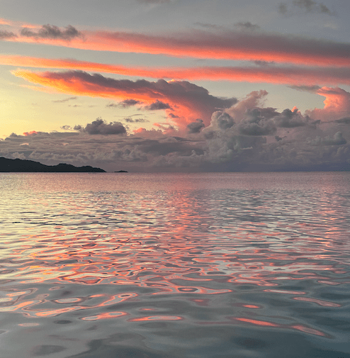 Zu Beginn des Törns hatte ich mich entsprechend auch einmal aufs Oberdeck verdrückt. Die Bank der Sitzecke war allerdings sehr schmal . Zu schmal für meinen XS Körper. Und überdies auch viel zu hart. Nach einer viel zu kurzen Nacht wachte ich sehr früh auf. Zum einen wegen des Weckruf eines Hahns. (kein Seemannsgarn; denn wir lagen nur unweit einer bewirtschafteten Mikroinsel an der Küste Praslins. ) Zum anderen wegen der gegen 05:00 Uhr einsetzenden Aurora am Horizont .