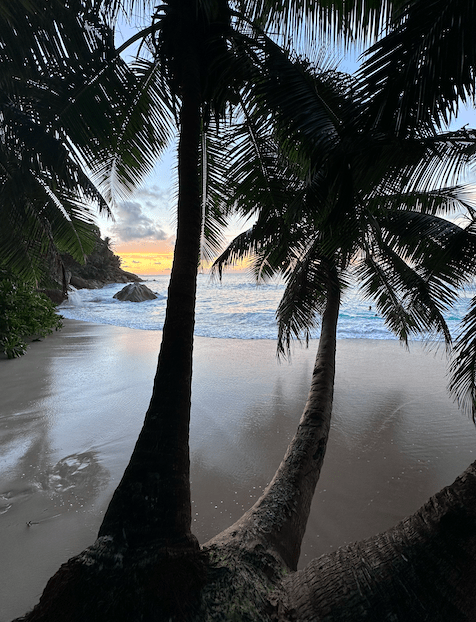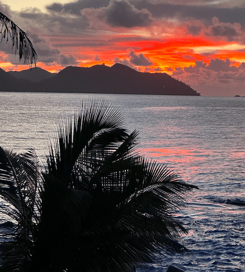 Nach dem Robinson Schwimmkurs kehrten wir zurück zum Hotel. Auf dem Weg dorthin vermuteten wir das wir gleich noch die freiwillige Feuerwehr von La Digue kennenlernen sollten. Aber es war nur der brennende Himmel am Horizont.