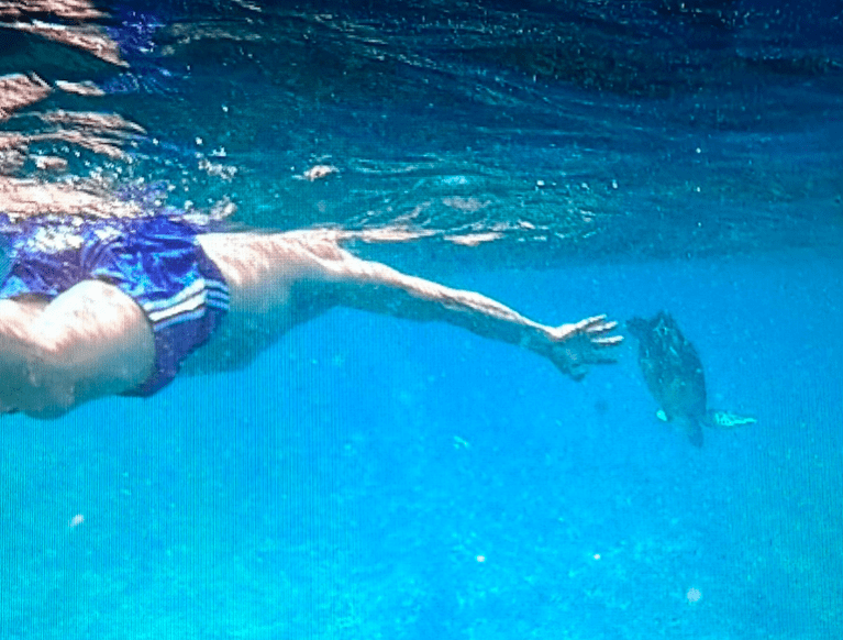 Ein anderes , in der Nähe liegendes, Boot hatte scheinbar „Wind davon bekommen“ und schickte alle seine Gäste ins Wasser. Ein lokaler Begleiter tauchte entsprechend ab und holte die wehrlose Schildkröte zur Schaustellung an die Wasseroberfläche. Schön das wenigstens eine der Damen bei dem Versuch Schildi zu berühren von der verängstigten Schildkröte gebissen wurde. Wahrscheinlich aber nur „gezwackt „ denn es floss offensichtlich kein Blut . Das war ein schlechtes Beispiel wie man es nicht machen sollte. Michael und ich verständigten uns auf Rückzug in Richtung unseres Kat .