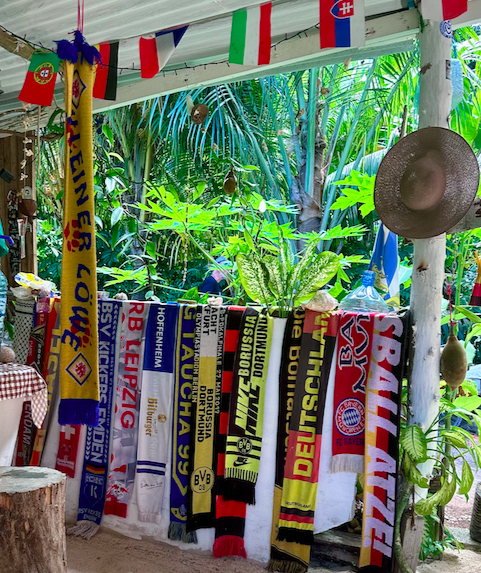 Einen besonderen Spot der Insel sollte man auf jeden Fall noch erwähnen . Eine Sportsbar ohne alkoholische Getränke auf der Preisliste. Statt dessen bekommt man bei Simons Fruit Shop frische Kokusnuss Stücke als Snack. Weiterhin frisch gepresste Fruchtdrinks aus dem Mixer. Was den Shop besonders macht sind unzählige Fussball Schals, ( vor allen deutscher Ligamannschaften)