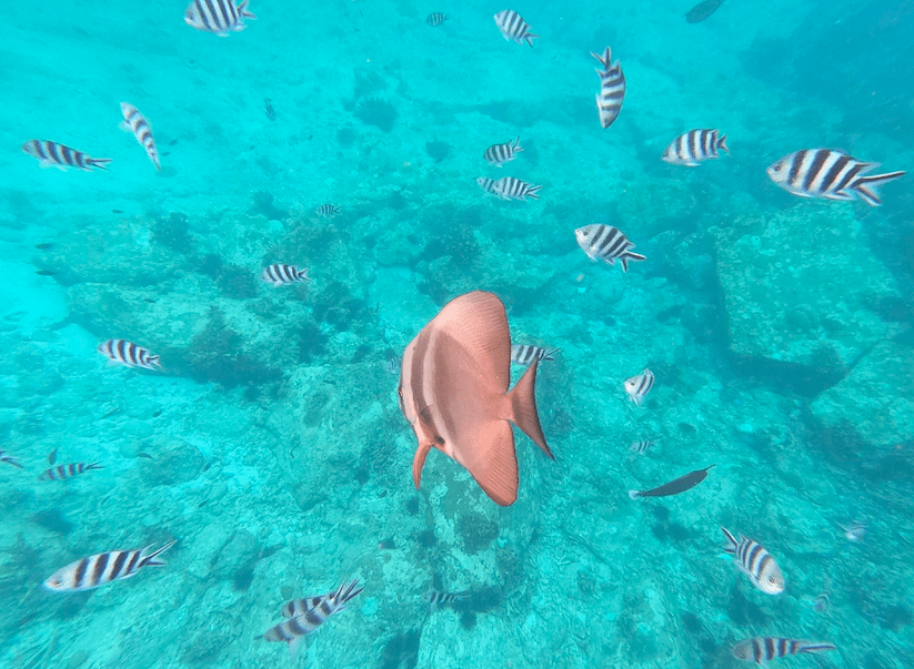 Die geringe Tiefe der küstennahen Schnorchelreviere erlaubt es einem relativ einfach das bunte Treiben am Grund verfolgen zu können. Teilweise sind mit einer guten Tauchmaske die Farben und Formen der Korallen und dessen Untermieter mit bloßem Auge zu erkennen. Je nach Sonnenstand lassen sich am Grund alle möglichen Meeresbewohner erkennen. Beeindruckend waren zum Beispiel auch die, für einen Sauerländer, befremdlich wirkenden Seegurken. Ebenso exotisch wie gefährlich sind die vielen Seeigel. So schöne das Leben dort unten daherkommt; aber man sollte immer schön die Corona Regeln befolgen. Zumindest was den Abstand angeht.