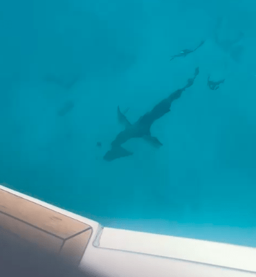 Mario hatte zuvor schon einmal einen anderen Riffhai vom Deck aus gefilmt. Dieser schwamm tatsächlich nicht am Grund, sondern war auf halber Höhe unterwegs. Generell sind die Kameraden eigentlich nicht angriffslustig . Zumindest solange man Sie nicht reizt. Ich möchte allerdings nicht wissen was in einem vorgeht wenn man unvermittelt sein breites Grinsen vor der Maske hätte.