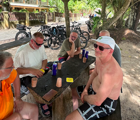 Anders als die erstaunlich geringe Anzahl an Touristen hatten wir nach einem erfrischenden Bad keine Strandtücher für unsere Astralkörper ausgebreitet. Statt dessen suchten wir uns am Tag 2 des Inselaufenthalts einen schattigen Platz mit Sitzgelegenheiten. Man mag es kaum glauben, aber Michael war vorbereitet. Er ist in der Regel für die Becher verantwortlich. Nicht die zum Trinken; sondern für unsere personalisierten Knobelbecher. Dazu dreizehn Pappen und schon kann es losgehen.